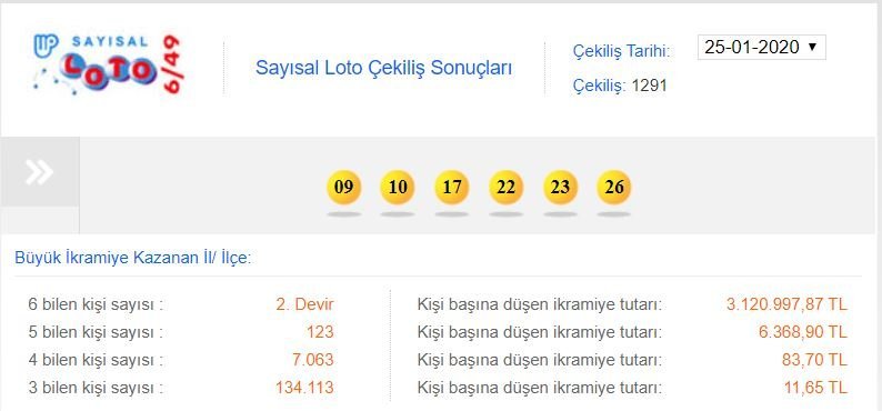 MPİ tarafından noter huzurunda gerçekleştirilen Sayısal Loto çekiliş sonuçları şu şekilde; 9 - 10 - 17 - 22 - 23 - 26