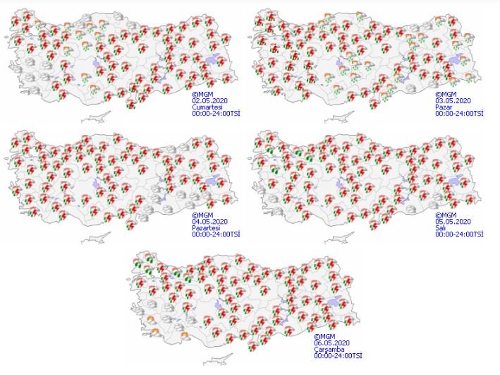 Meteoroloji Genel Müdürlüğü tarafından yapılan son değerlendirmelere göre: Ülkemiz geneli parçalı ve çok bulutlu, Marmara, Akdeniz, Batı ve Orta Karadeniz'in iç kesimleri, Doğu Karadeniz, İç Anadolu, Doğu Anadolu ve Güneydoğu Anadolu ile Afyonkarahisar, Kütahya ve Ordu çevrelerinin sağanak ve yer yer gök gürültülü sağanak yağışlı geçeceği tahmin ediliyor. Yağışların; öğleden sonra Osmaniye çevreleri ile Hatay kıyılarında kuvvetli olması bekleniyor.