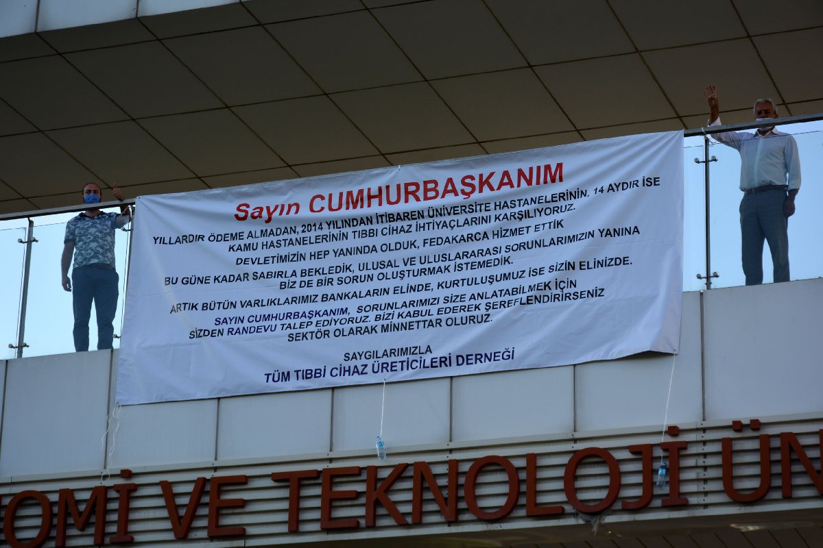 TÜDER tarafından asılan pankarta; “Sayın Cumhurbaşkanım,Yıllardır ödeme almadan, 2014 yılından itibaren üniversite hastanelerinin, 14 aydır ise kamu hastanelerinin tıbbi cihaz ihtiyaçlarını karşılıyoruz. Devletimizin hep yanında olduk, fedakarca hizmet ettik. Bugüne kadar sabırla bekledik. Ulusal ve uluslararası sorunlarımızın yanına biz de bir sorun oluşturmak istemedik. Artık bütün varlıklarımız bankaların elinde, kurtuluşumuz ise sizin elinizde. Sayın Cumhurbaşkanım, sorunlarımızı size anlatabilmek için sizden randevu talep ediyoruz. Bizi kabul ederek şereflendirirseniz sektör olarak minnettar oluruz.” İfadelerine yer verildi.