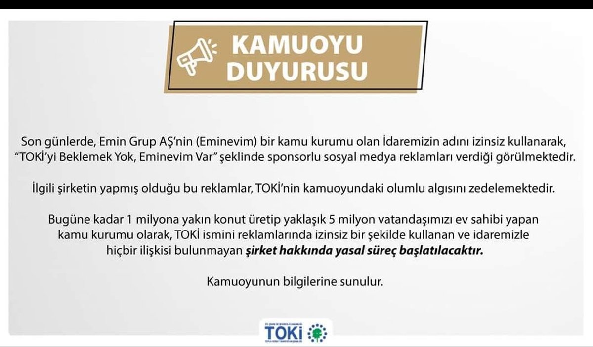 *Son günlerde, Emin Grup AŞ’nin (Eminevim) bir kamu kurumu olan İdaremizin adını izinsiz kullanarak, “TOKİ’yi Beklemek Yok, Eminevim Var” şeklinde sponsorlu sosyal medya reklamları verdiği görülmektedir.