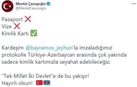 Dışişleri Bakanı Mevlüt Çavuşoğlu, imzalanan protokolle Türkiye-Azerbaycan arasında çok yakında sadece kimlik kartıyla seyahat edilebileceğini duyurdu.