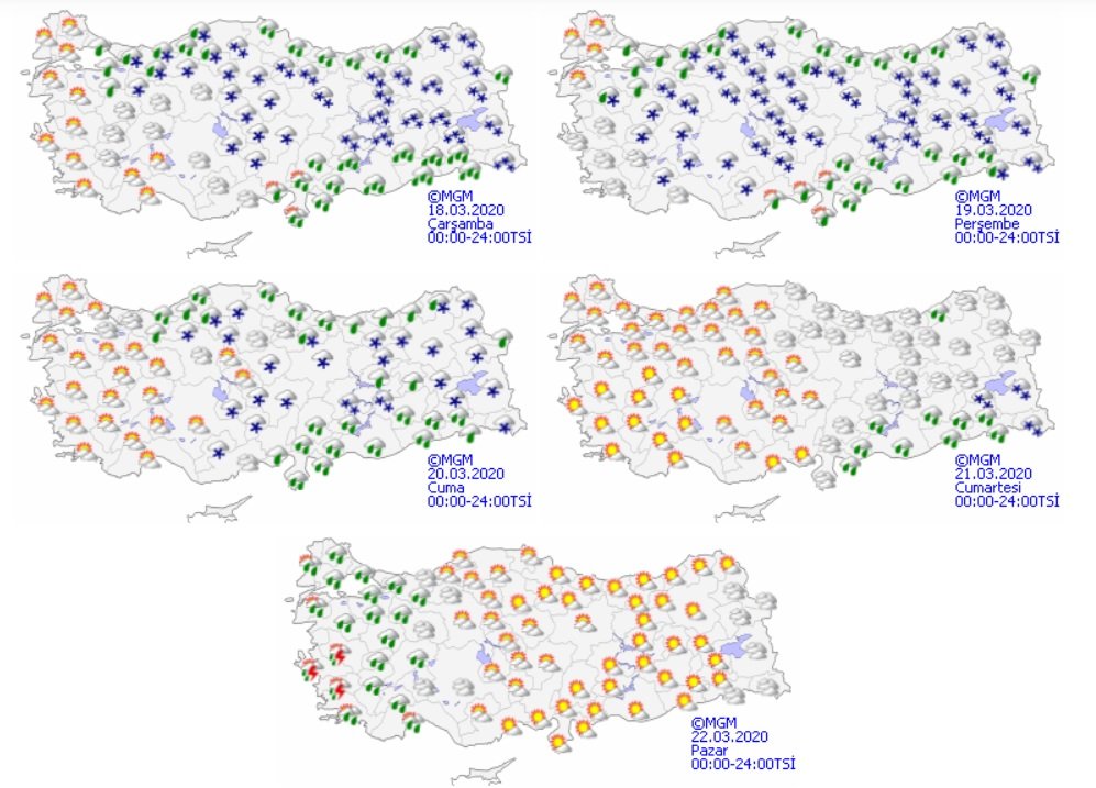 Yapılan son değerlendirmelere göre; yarın (Salı) ve Çarşamba günü (18.03.2020) Güney Doğu Anadolu ile Doğu Anadolu'nun güneyinde çok kuvvetli ve yer yer şiddetli (51-100 kg/m2) sağanak yağış, rakımı 1500 m ve üzeri yerlerde ise karla karışık yağmur ve kar yağışı beklendiğinden sel, su baskını ve ulaşımda aksamalar gibi olumsuzluklara karşı dikkatli ve tedbirli olunmalıdır.