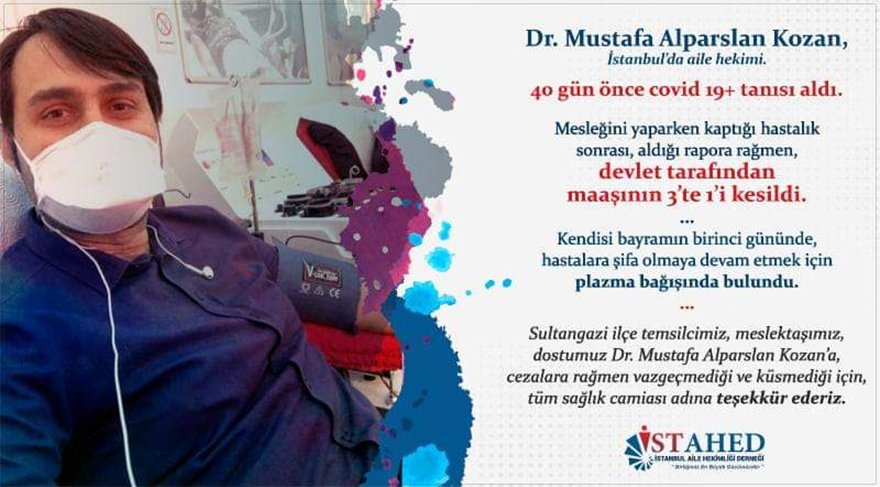 *Maalesef çalışamadığı günlerin ücreti kesilmiş, kendisine 14 günlük karantina sürecine ait ücretinin yarısı ödenmişti. Covid-19’la olan mücadelesini kazanan Dr. Mustafa Alparslan Kozan görevinin başına dönmekle kalmamış, virüse karşı oluşan antikorlarını da başka canlara can katmak için kullanılabilmesi için plazmasını da bağışlamıştı.