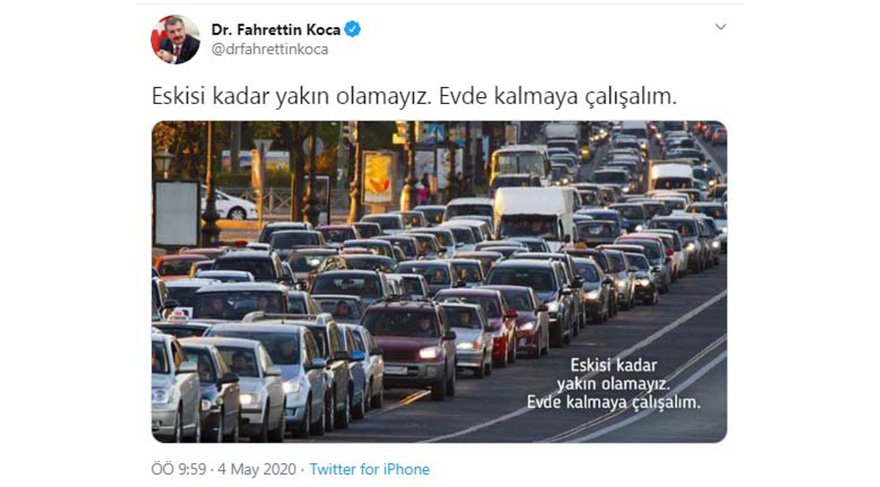 Bakan Koca, bu paylaşımla birlikte corona virüsü tedbirleri kapsamında vatandaşlara çağrıda bulunarak, "Eskisi kadar yakın olamayız. Evde kalmaya çalışalım" ifadelerini kullandı.