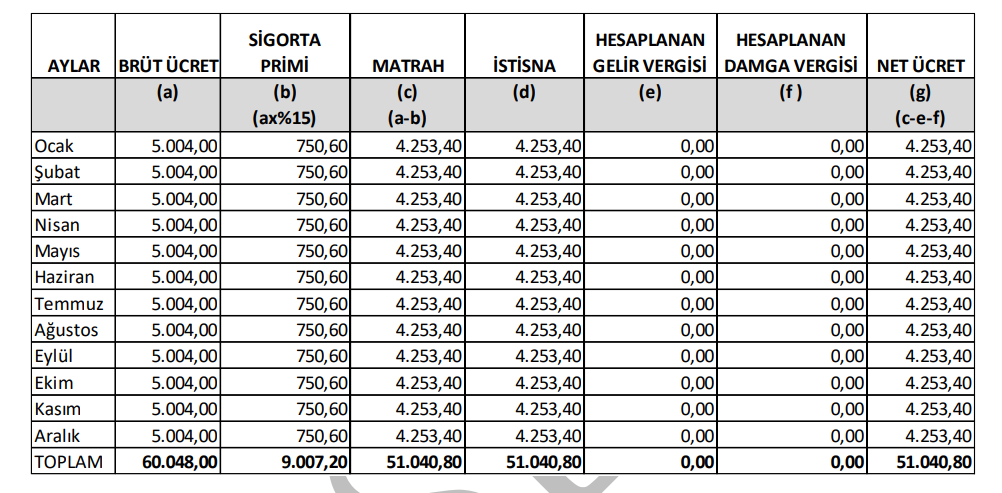 Ödenecek vergi tutarı, bu suretle bulunan vergi tutarının içinde istisna tutara isabet eden kısım düşülmek suretiyle hesaplanır. İstisna nedeniyle alınmayacak olan vergi ilgili ayda aylık asgari ücret üzerinden hesaplanması gereken vergiyi aşamaz. Birden fazla işverenden ücret alanlarda bu istisna sadece en yüksek olan ücrete uygulanır"