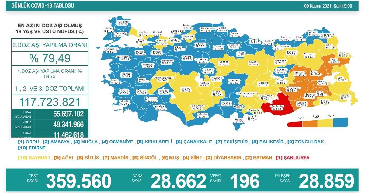 18 yaş ve üzeri nüfusun aşılanması verilerinde 1’inci doz Türkiye ortalaması yüzde 89.73, 2’nci doz ortalaması yüzde 79.49 olarak ölçüldü. Ayrıca, 1’inci dozda 55 milyon 697 bin 102, 2’nci dozda 49 milyon 341 bin 966 ve 3’üncü dozda 11 milyon 462 bin 618 olmak üzere toplam 117 milyon 723 bin 821 aşı uygulandı.