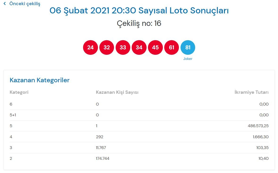 6 Şubat Çılgın Sayısal Loto‘nun çekiliş sonuçları, ‘24-32-33-34-45-61-joker 81′ oldu.