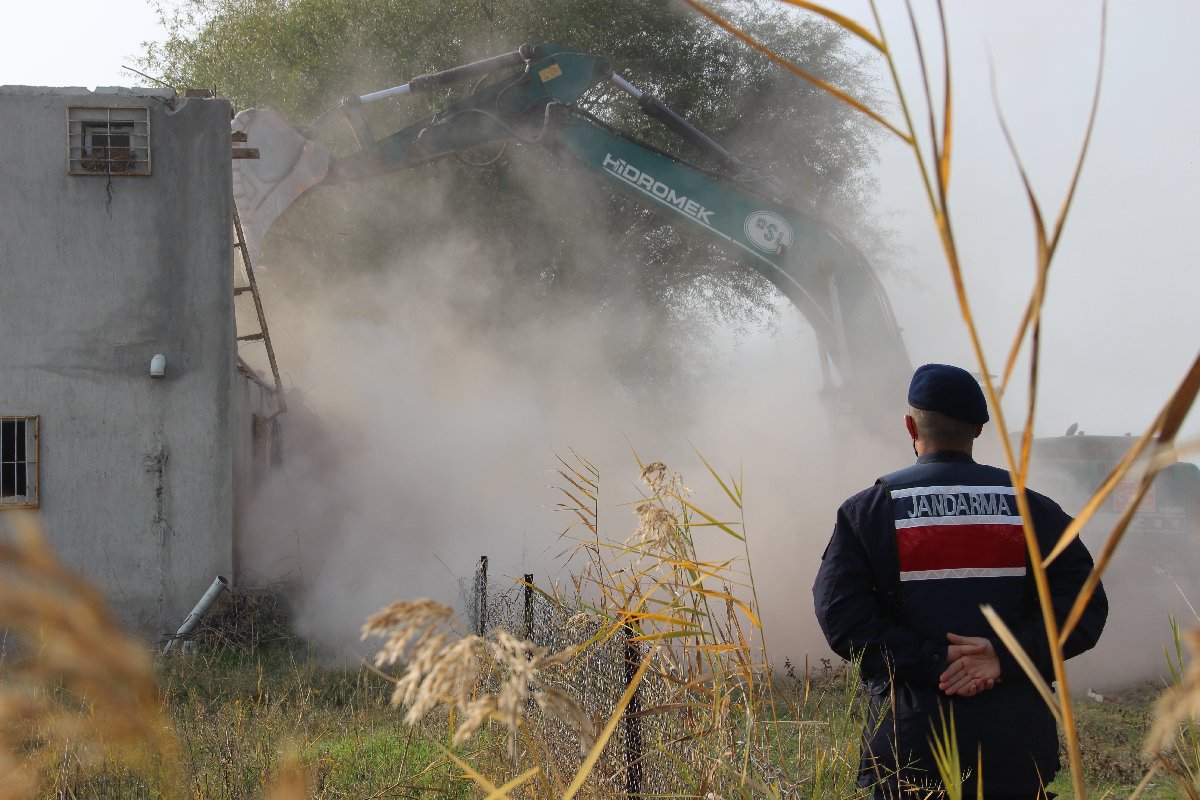 Tamamen kuruyan Manisa’daki Marmara Gölü havzasını işgal edenler birer birer tespit edilerek düzenlenen tutanaklarla haklarında işlemlere başlandı. Sadece bu yıl içinde 23 adet hayvan damı ve ağıl tespit edilirken kurulan komisyon eşliğinde yıkım çalışmaları devam ediyor. Manisa İl Jandarma Komutanlığına bağlı ekipler tarafından bölgede güvenlik amaçlı önlem alınan yıkım çalışmalarına Gölmarmara Kaymakamı Celil Ateşoğlu da katılarak çalışmaları yerinde inceledi. Yıkım çalışmaları DSİ’ye ait iş makineleriyle gerçekleşirken, Milli Emlak, DSİ, Gölmarmara İlçe Tarım ve Orman Müdürlüğü ile emniyet güçleri de yıkım çalışmalarında hazır bulundu.