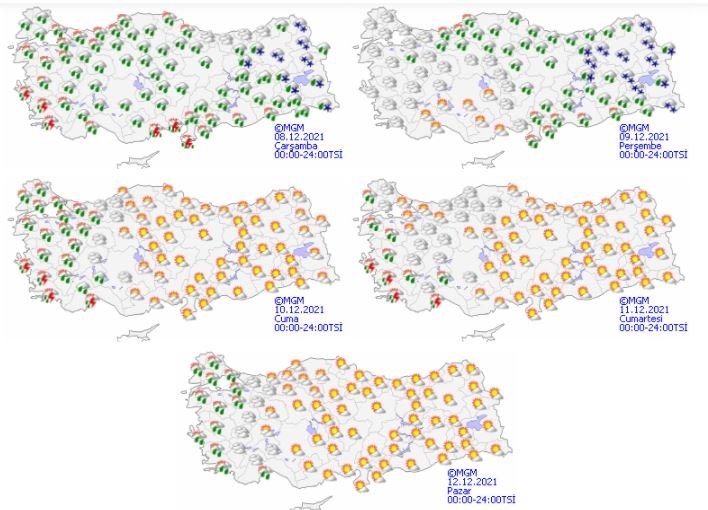 Meteoroloji Genel Müdürlüğü tarafından yapılan son değerlendirmelere göre: Ülkemiz genelinin çok bulutlu ve yağışlı geçeceği tahmin ediliyor. Yağışların, genellikle yağmur ve sağanak, Ege ve Akdeniz kıyılarında gök gürültülü sağanak, Akdeniz'in Toroslar Mevkisi, Batı ve Doğu Karadeniz'in iç ve yüksek kesimleri ile Doğu Anadolu'nun kuzey ve doğusunda karla karışık yağmur ve yer yer kar şeklinde görüleceği tahmin ediliyor.