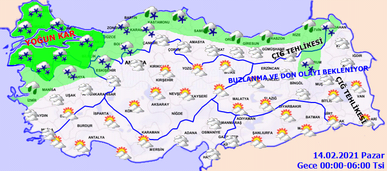Doğu kesimlerde de buzlanma ve don olayı bekleniyor. Doğu Karadeniz’in iç kesimleri ile Doğu Anadolu’nun güneydoğusunda çığ tehlikesi bulunuyor. Hava sıcaklıklarının mevsim normallerinin 6 ila 12 derece üzerinde seyredeceği tahmin edilen, Doğu Karadeniz’in iç kesimleri ile Doğu Anadolu’nun güneydoğusunda kar erimesi bekleniyor. Kar erimesi nedeniyle su baskını ve dik yamaçlarda çığ oluşma riskine karşı dikkatli ve tedbirli olunması gerekiyor