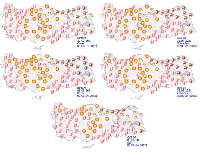 Meteoroloji Genel Müdürlüğü tarafından yapılan son değerlendirmelere göre; Ülkemizin doğu kesimlerinin parçalı ve yer yer çok bulutlu, Doğu Karadeniz kıyıları ile Tokat, Artvin, Erzurum, Kars, Ardahan, Van ve Hakkari çevrelerinin yerel olmak üzere aralıklı sağanak ve gök gürültülü sağanak yağışlı, diğer yerlerin az bulutlu ve açık geçeceği tahmin ediliyor.