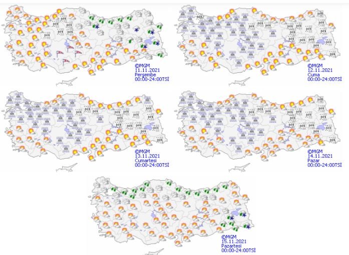 Meteoroloji Genel Müdürlüğü tarafından yapılan son değerlendirmelere göre: Ülkemizin kuzey ve doğu kesimlerinin parçalı ve çok bulutlu, Orta ve Doğu Karadeniz kıyıları ile Iğdır, Bitlis, Van ve Siirt çevrelerinin yağmur ve sağanak, Ağrı ve Hakkâri çevrelerinin karla karışık yağmur ve kar yağışlı geçeceği tahmin ediliyor. Bu sabah ve gece saatlerinde İç Anadolu'nun kuzey, Karadeniz'in iç kesimleri ile Doğu Anadolu'nun kuzeyinde pus, yer yer sis hadisesi ile birlikte buzlanma ve don olayı bekleniyor.