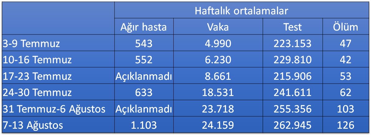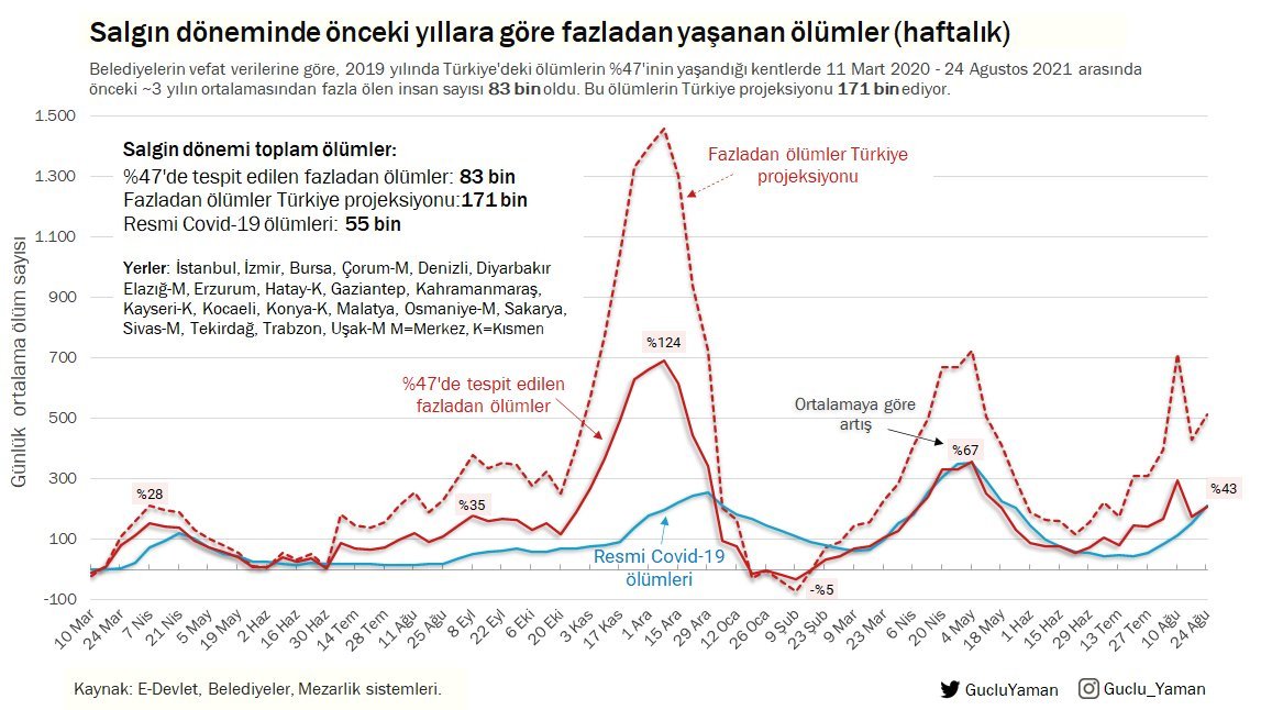 TTB Pandemi Çalışma Grubu üyesi yazılımcı Güçlü Yaman’da fazladan ölümleri değerlendirerek, “18-24 Ağustos haftasında Türkiye'deki ölümlerin yüzde 44'ünün yaşandığı kentlerde ölümler önceki 3 yıl ortalamasına göre yüzde 43 arttı. Fazladan ölümler Türkiye projeksiyonunun günlük ortalaması 510, günlük resmi Covid ölüm ortalaması 213 oldu. Belediyelerin vefat verilerine göre, 2019 yılında Türkiye'deki ölümlerin yüzde 47'inin yaşandığı kentlerde 11 Mart 2020-24 Ağustos 2021 arasında önceki son 3 yılın ortalamasından fazla ölen insan sayısı 83 bin, bu ölümlerin Türkiye projeksiyonu 171 bin ediyor” şeklinde konuştu.
