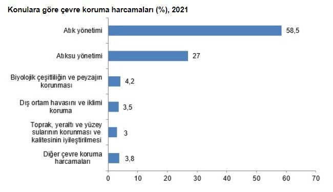 Buna göre, çevre koruma harcamaları 2021 yılında bir önceki yıla göre yüzde 59,2 artarak toplam 66,3 milyar TL'ye çıktı.