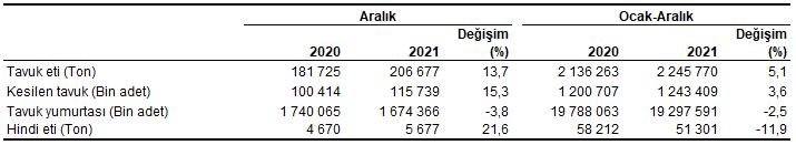 2021 yılının tamamında önceki yıla göre tavuk eti üretimi yüzde 5,1, kesilen tavuk sayısı yüzde 3,6 artarken tavuk yumurtası üretimi yüzde 2,5, hindi eti üretimi yüzde 11,9 azaldı.