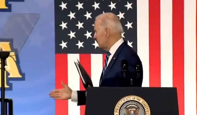 Biden'ın sosyal medyada da gündem olan görüntülerinde konuşmasını bitirdikten sonra el sıkacak birini aradığı görülüyor. ABD Başkanı kimseyi bulamayınca etrafında dönmeye başlıyor. Şaşkın bakışlarla arkasını dönen Biden daha sonra kürsüden ayrılıyor.