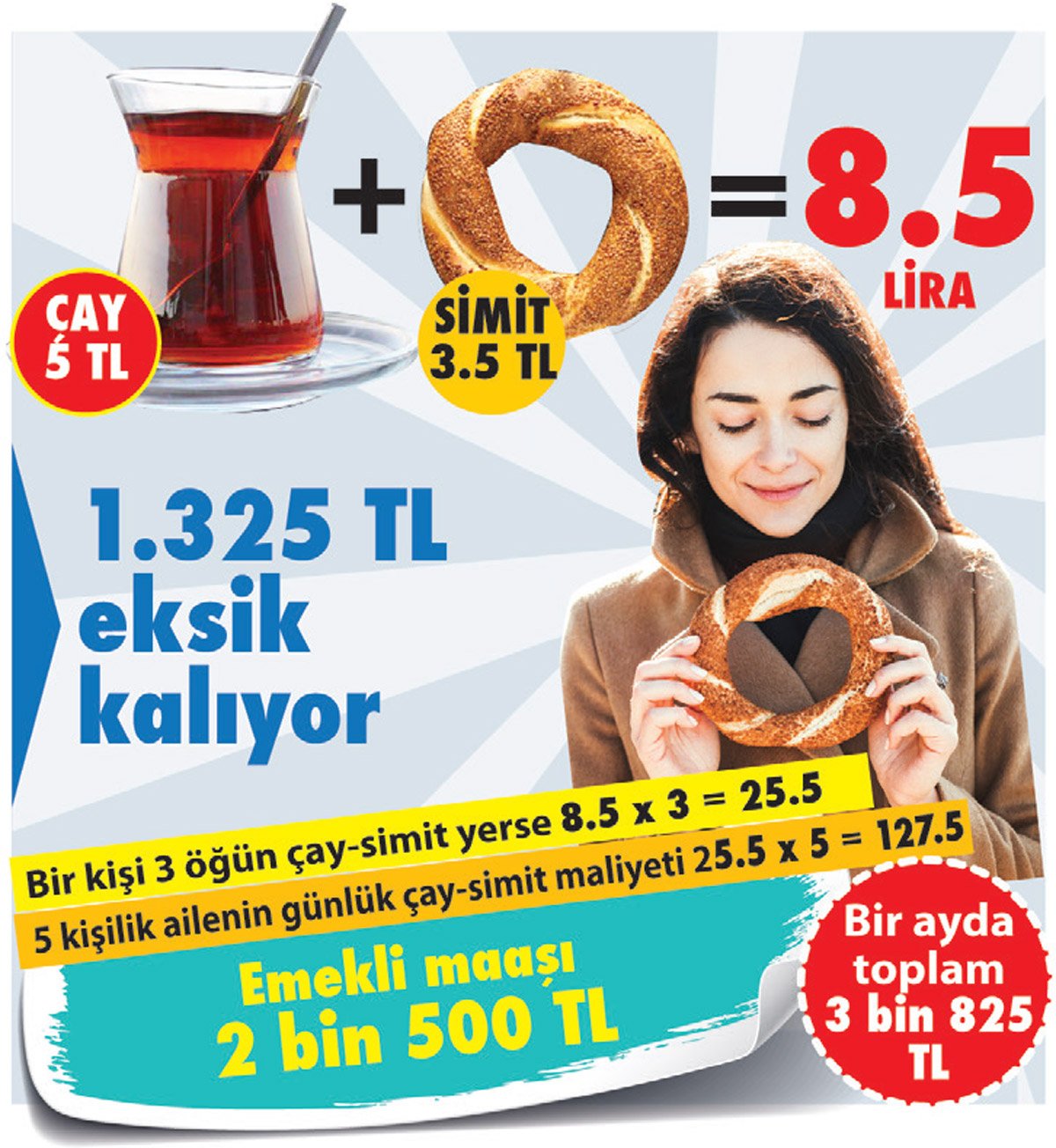 Erdoğan, 1993 yılında Refah Partisi’nde siyaset yaparken, Çiller iktidarını ‘Çay simit’ hesabı ile eleştirmiş ve 5 kişilik bir ailenin üç öğün çay simitle beslenmesi halinde dahi, bütçesinin açık verdiğini belirtmişti. AKP iktidarı döneminde de emekli çay-simitle beslenemez oldu. Emekli maaşıyla geçinen ve Erdoğan’ın tavsiyesine uyarak üç çocuk yapan bir ailenin günde 3 öğün çay simit ile beslenmesi için ihtiyacı olan tutar 3 bin 825 liraya yükseldi.
