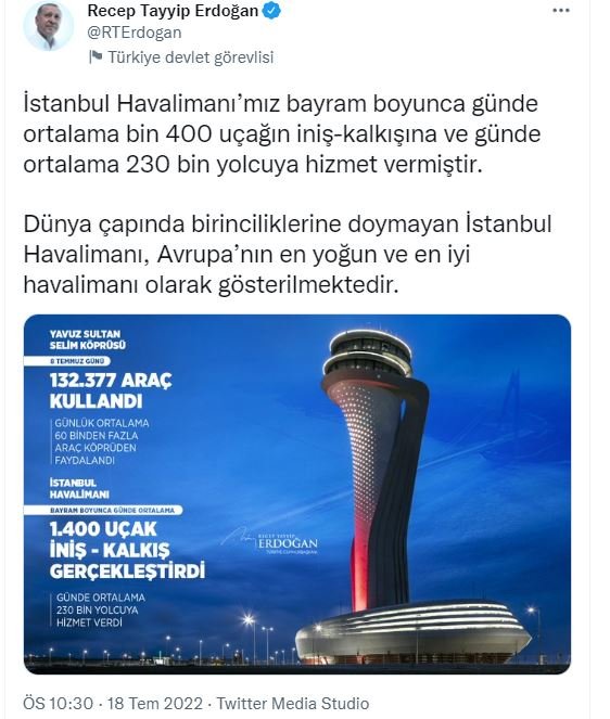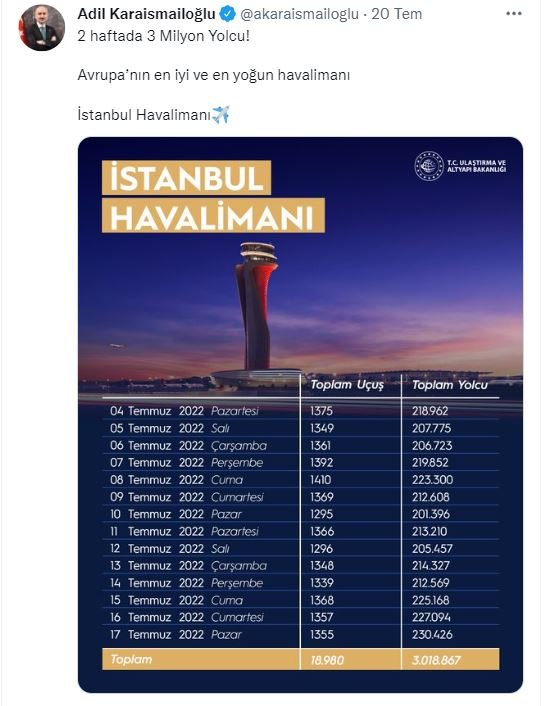 [old_news_related_template title="Erdoğan gururla paylaştı ama İGA, Atatürk'ü geçemedi" desc="Cumhurbaşkanı Erdoğan, 'Dünya çapında birinciliklere doymuyor' diyerek gözde müteahhitlerin işlettiği İstanbul Havalimanı'yla ilgili istatistikleri paylaştı. Ancak verdiği rakamlar açıklanan hedeflerin yarısına bile ulaşmıyor. Rakamlar, pistleri kırılarak kapatılan Atatürk Havalimanı'nın 4 yıl önce ulaştığı noktanın çok daha gerisinde... " image="https://sozcuo01.sozcucdn.com/wp-content/uploads/2022/07/19/iecrop/aw530109_10-kopya_16_9_1658221066.jpg" link="https://www.sozcu.com.tr/2022/ekonomi/erdogan-gururla-paylasti-ama-iga-ataturku-gecemedi-7256852/"]