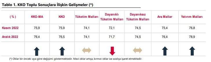 Kapasite kullanım oranı aralıkta bir önceki aya göre tüketim mallarında sabit kalırken, ara mallarda 1 puan artışla yüzde 76,4'e, yatırım mallarında 2,1 puan artışla yüzde 78,9'a yükseldi.