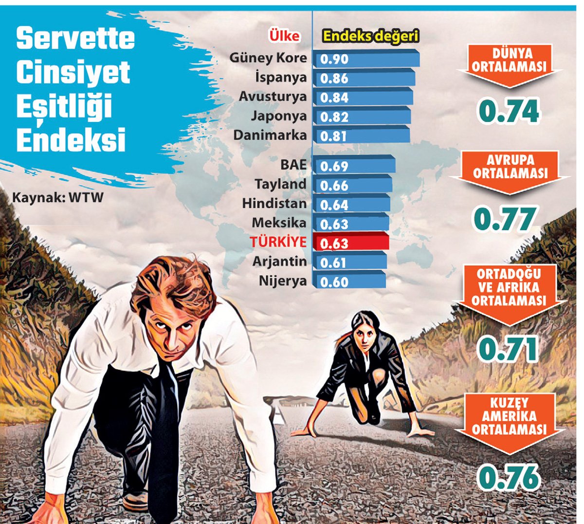Rapora göre Türkiye 0.63 endeks değeri ile 0.74 olan global ortalamanın oldukça gerisinde. Bu değer, Türkiye’de kadınların emekliliklerine kadar erkeklerin sadece yüzde 63’ü kadar bir varlığa sahip olabildiği anlamına geliyor. Türkiye’nin altında sadece iki ülke var; 0.61 ile Arjantin ve 0.60 endeks değeri ile Nijerya. Türkiye’nin endeks değeri, kadınlarla erkekler arasındaki servet eşitsizliğinde 0.71 olan Ortadoğu ve Afrika ortalamasının bile gerisinde. Asya Pasifik bölgesi ile Kuzey Amerika’da endeks ortalaması 0.76 iken, eşitliğin en yüksek olduğu bölgenin 0.77 ortalamalı Avrupa olduğu dikkat çekiyor. Latin Amerika ortalaması ise 0.67’ye kadar düşüyor ama yine de Türkiye’nin endeks değerinin üzerinde kalıyor.