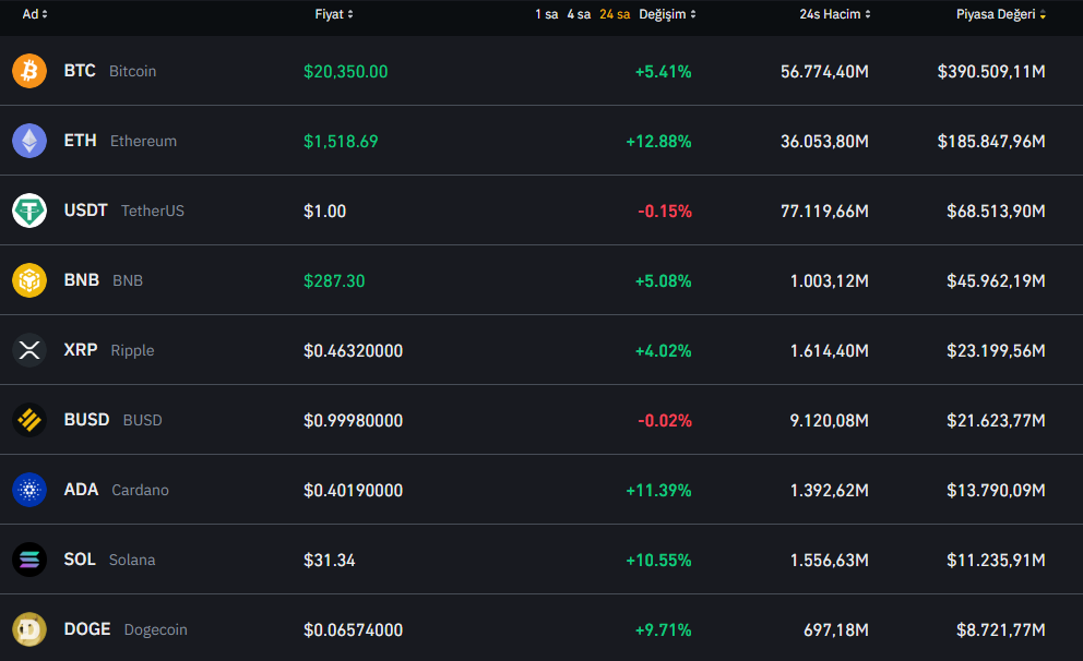 Cardano yüzde 11,4 artışla 0,401 dolardan, Solana yüzde 10,3 artışla 31,24 Dogecoin ise yüzde 9,7 artışla 0,0659 dolardan işlem gördü. Ripple'daki artış ise yüzde 3,8 olarak gerçekleşti. Ripple 0,462 dolardan işlem gördü.