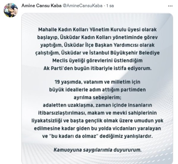 Kaba “Mahalle Kadın Kolları Yönetim Kurulu Üyesi olarak başlayıp kadın kollarında görev yaptığım, Üsküdar İlçe Başkan Yardımcısı olarak çalıştığım ve İstanbul Büyükşehir Belediye Meclis üyeliği görevlerini üstlendiğim Ak Parti’den bugün itibariyle istifa ediyorum” dedi.