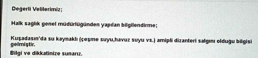 Kuşadası’nda su kaynaklı (çeşme suyu, havuz suyu v.s.) amipli dizanteri salgını olduğu bilgisi gelmiştir. Bilgi ve dikkatinize sunarız” mesajını gönderdi. Mesaj kısa sürede sosyal medya platformlarında günün konusu haline geldi. Veliler sağlıklı bilgi almak için ilgilileri açıklama yapmaya davet etti.