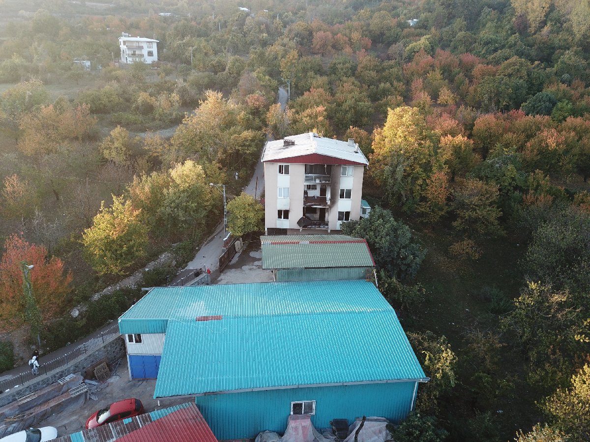 9 kişinin hayatını kaybettiği oda ve yangın çıkan bina, dronla da havadan görüntülendi. Görüntülerde odada bir soba olduğu ve eşyaların yanarak kullanılmaz hale geldiği görüldü.