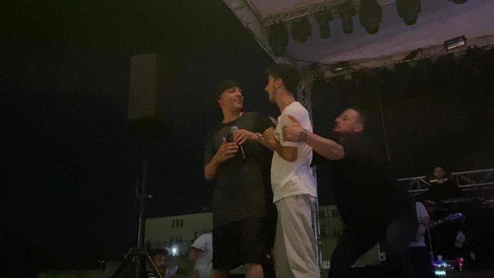 Bir hayranı ise ünlü sanatçıya sarılabilmek için kendisini sahneye attı. Ceza’nın yanına kadar giden şahıs, görevliler tarafından sahneden indirildi. İHA