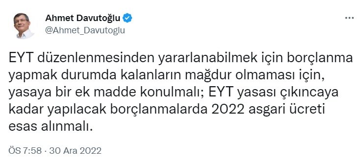 Davutoğlu, "EYT düzenlenmesinden yararlanabilmek için borçlanma yapmak durumda kalanların mağdur olmaması için, yasaya bir ek madde konulmalı; EYT yasası çıkıncaya kadar yapılacak borçlanmalarda 2022 asgari ücreti esas alınmalı" ifadelerini kullandı.