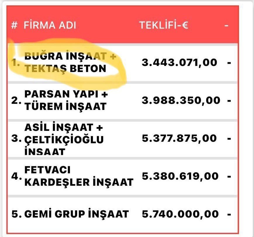 - Bu ihaleyi 4 milyon 462 bin Euro’ya tamamlamayı taahhüt eden Atilla İnşaat ve Ekip Mühendislik Ortaklığı kazanıyor. Ama, süreç yine uzuyor. Sonra hem ihaleyi kazanan firma, hem de en düşük 2 ve 3. teklifi veren firmalar ihale dışı bırakılıyor. Böylelikle ihale Buğra İnşaat- Aysel İnşaat ortaklığına kalıyor. Bunların teklifi ise 6 milyon 474 bin Euro.