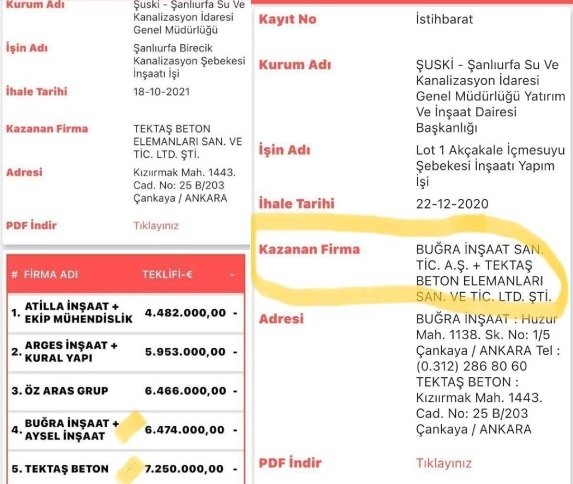 - Bir bakıyorsunuz bu firma da ihaleden çekilerek, meydanı halen Akçakale İçme Suyu Şebeke işini ortaklaşa yaptıkları Tektaş İnşaat’ın 700 bin Euro daha yüksek bedelli teklifine bırakıyor. Şimdi sormak lazım, insan kazanmak için girdiği ihale kendisine verildiğinde neden almaktan vaz geçip bir alt sıradaki ortak iş yaptığı firmanın almasını sağlar? Çünkü, onlar alırsa devletten 700 bin Euro daha fazla alacak.