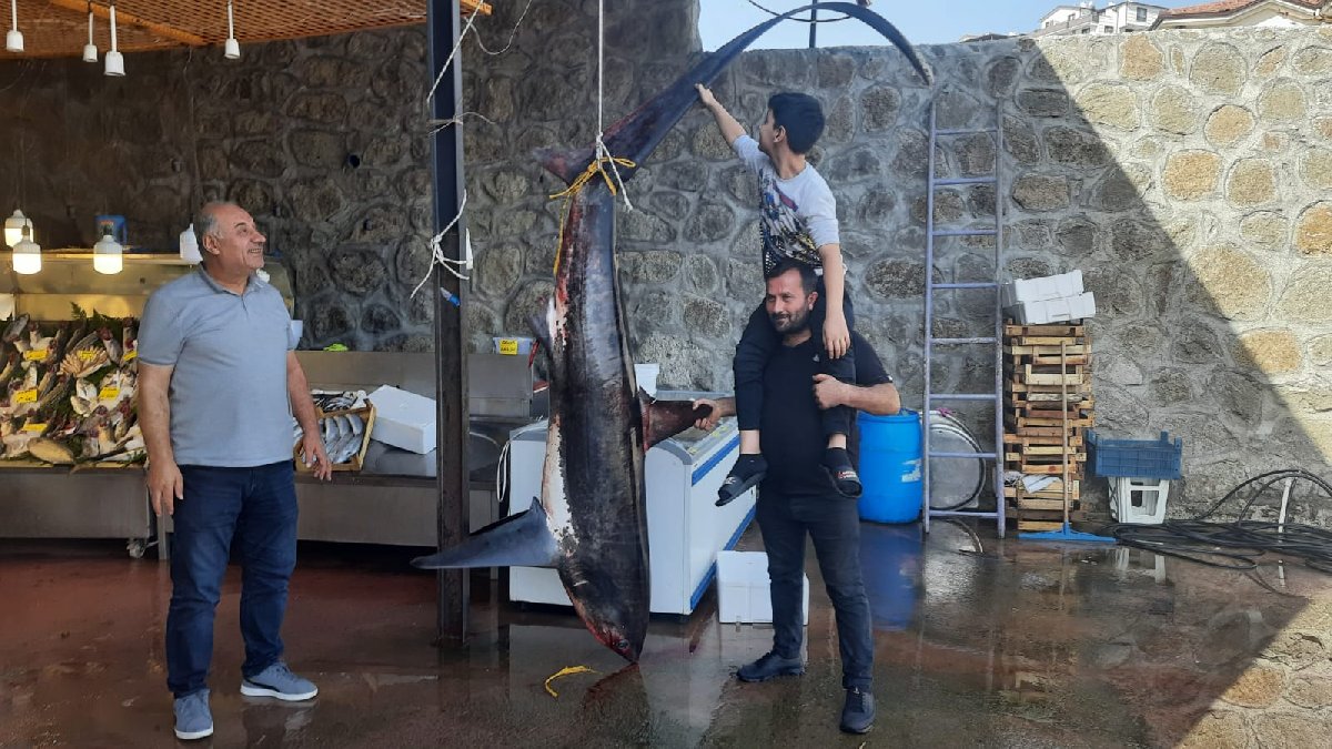 Teknede bulunan kişilerin yardımıyla bir saatlik uğraşın ardından ağa takılan balığı çıkaran Şahin, yaklaşık 3,5 metre uzunluğunda, 350 kilo ağırlığında camgöz köpek balığı avladığını gördü.