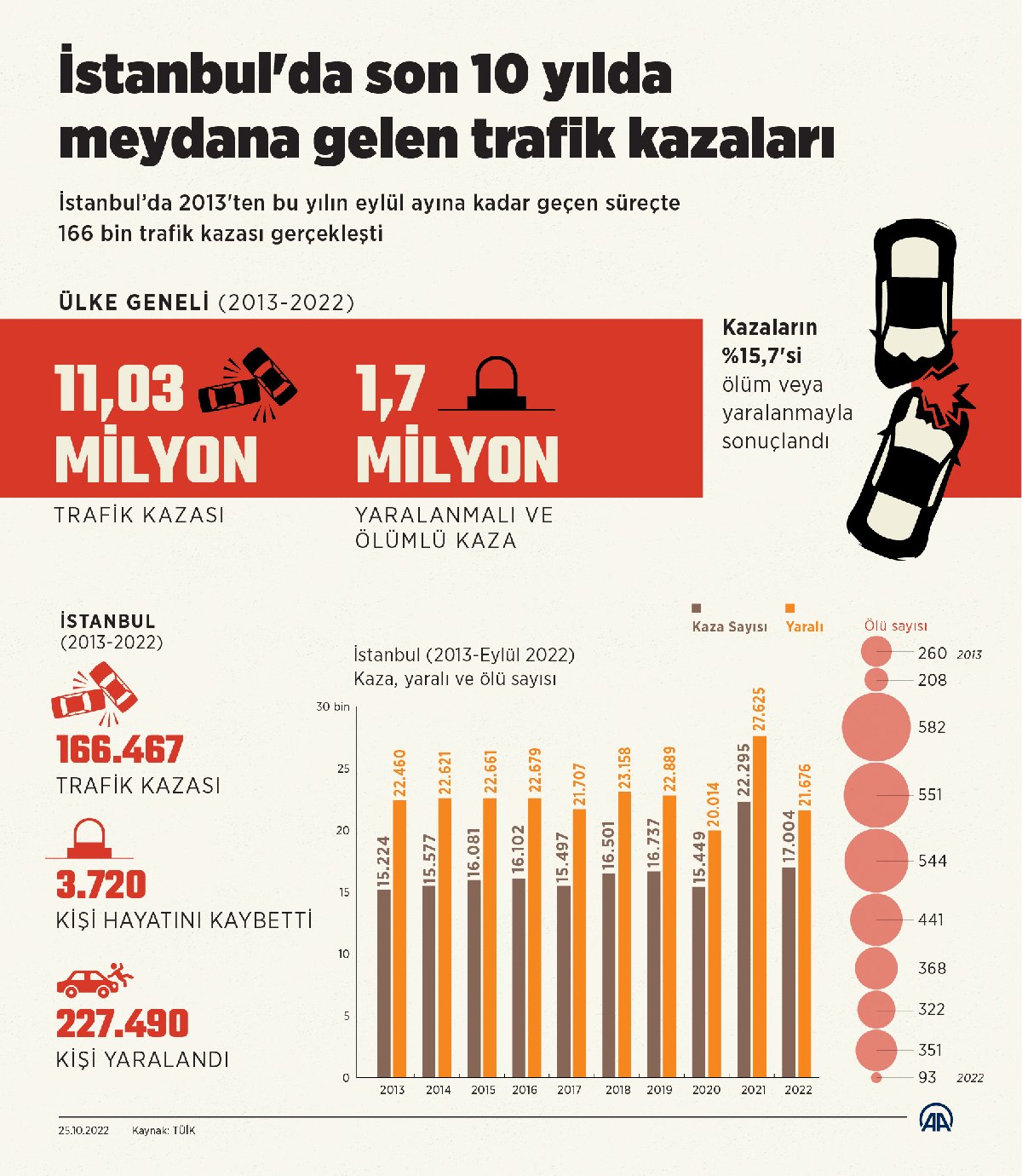 Verilere bakıldığında, 2013'ten Eylül 2022'ye kadar geçen süreçte en fazla ölümlü kaza 2015'te gerçekleşirken, yaralı sayısının en çok olduğu yıl 2018 olarak kayıtlara geçti. Toplam kaza sayısı açısından ise geçen yıl başı çekti. (AA)