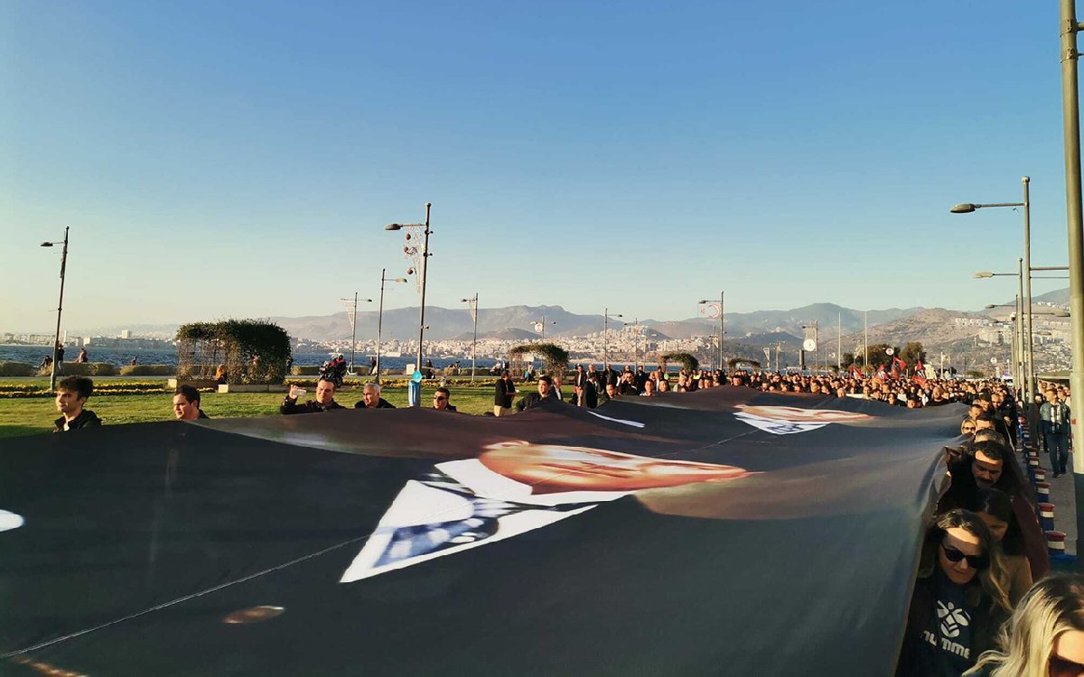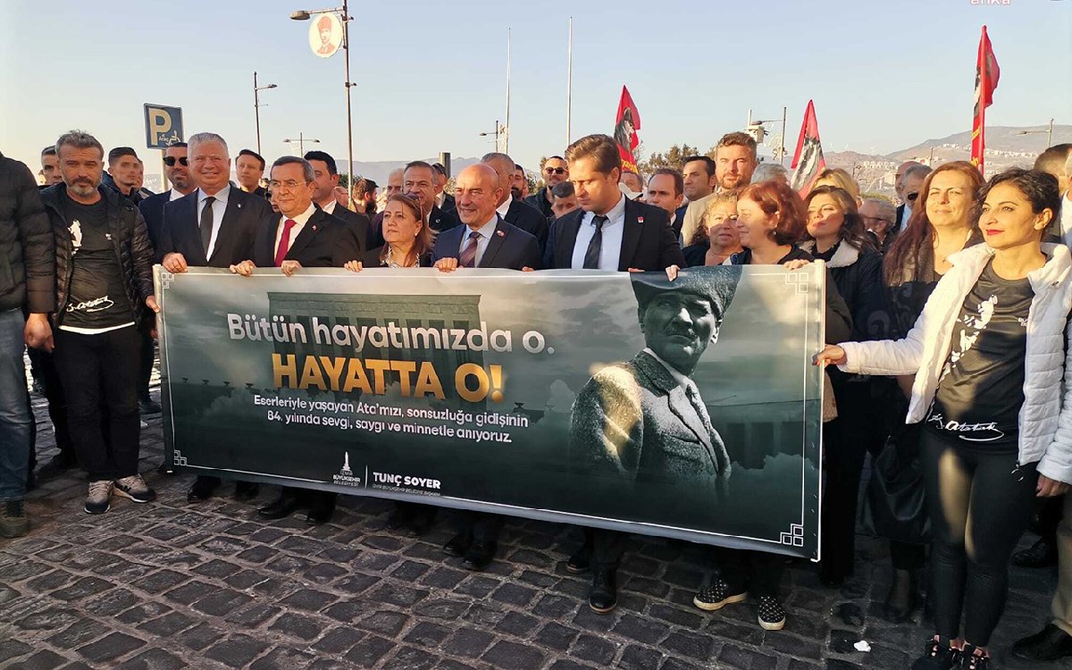 Alsancak Kordonboyu'nda üzerinde, 350 metrelik Atatürk resmi Cumhuriyet Meydanı'na kadar taşındı. Tunç Soyer ve beraberindekiler de "Bütün hayatımızda O. Hayatta O" yazılı pankartla yürüdü.