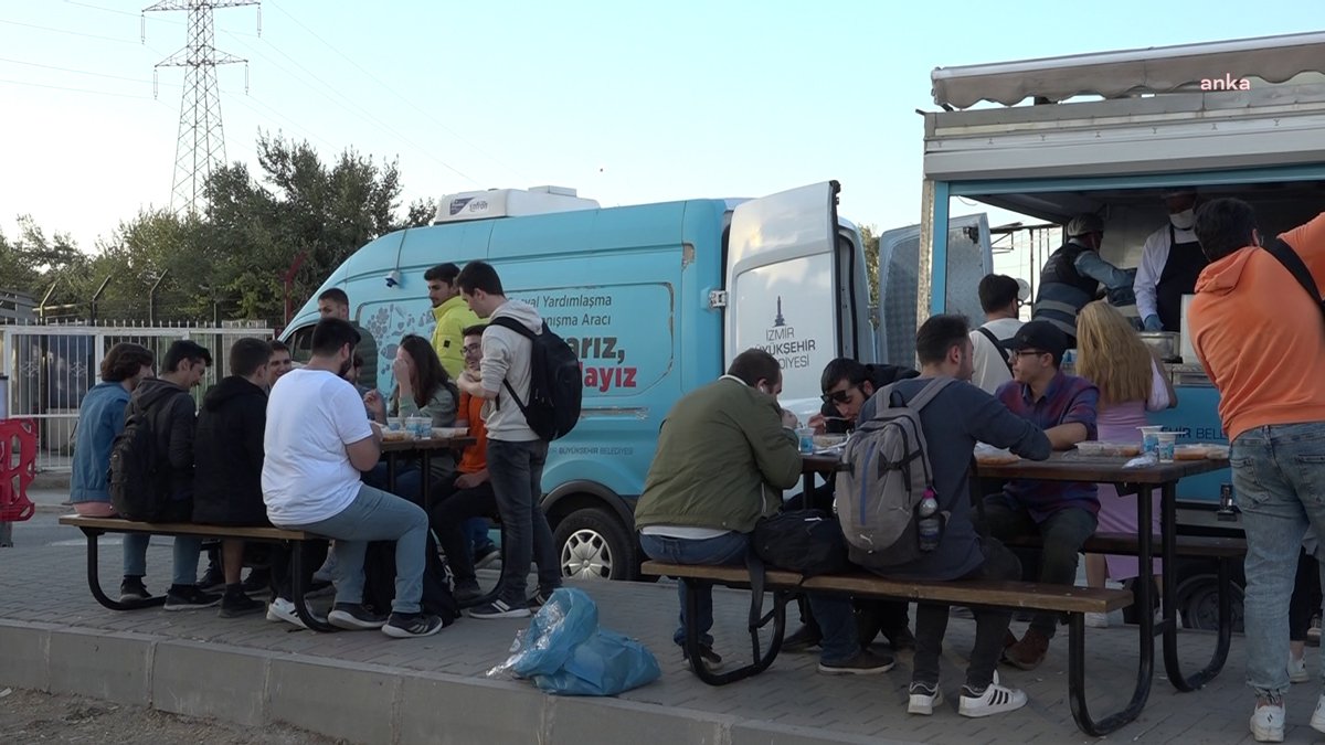 CHP'li İzmir Büyükşehir Belediyesi'nin üniversite öğrencilerine ücretsiz yemek hizmetine kapıları kapatan İzmir Katip Çelebi Üniversitesi yönetimi, tepki çeken o görüntülerin ardından yine de geri adım atmadı. Kampüs içine girmelerine izin verilmeyen belediye ekipleri, bu kez üniversite kapısı önüne bank ve masa getirip yemek dağıtımını sürdürdü.
