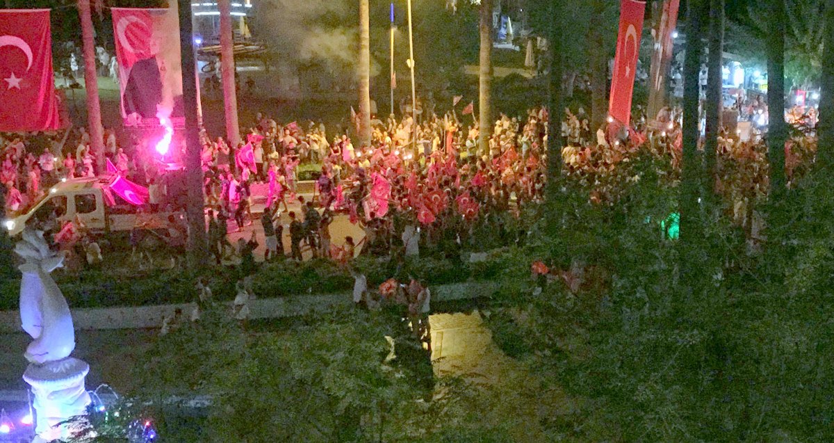 Atatürk Caddesi’nde saat 21.00’de yürüyüşe gecen binlerce topluluk ellerinde meşalelerle Atatürk Meydanına kadar başta İzmir Marşı olmak üzere şarkı ve türkülerle yürüyerek geldi. Metrelerce uzunluktaki Türk Bayrağı altında yürüyen binler, ülkenin geleceğine güvenle bakıldığının ve bekçisi olduklarının sinyalini verdi. Atatürk Meydanı’nda Atatürk’ün heykeli önündeki kutlamalar 19 Mayıs Meydanına kadar taştı. Kutlamaları turistler ilgiyle izledi.
