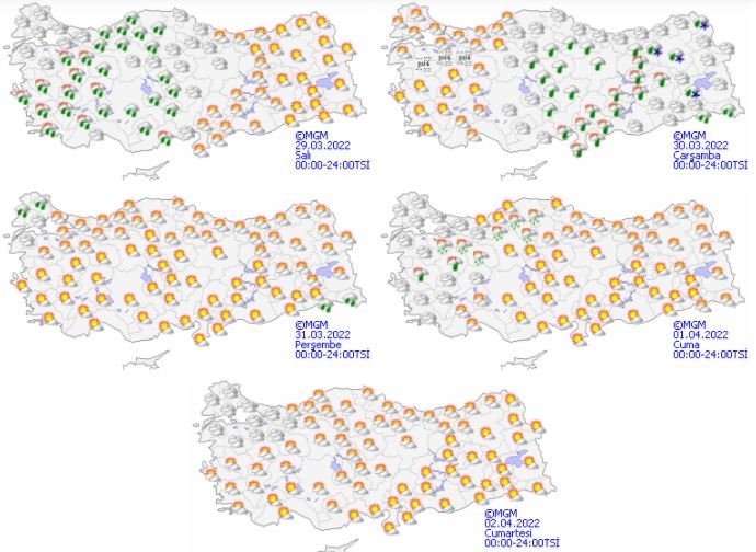 Meteoroloji Genel Müdürlüğü tarafından yapılan son değerlendirmelere göre: Ülkemizin batı kesimlerinin parçalı yer yer çok bulutlu, İç Ege, Batı Akdeniz'in iç kesimleri, İç Anadolu'nun güney ve batısı, Batı Karadeniz, Balıkesir, Bursa, Bilecik, Muğla, Kahramanmaraş, Osmaniye, Gaziantep ve Kilis çevreleri ile Mersin'in iç ve yüksek kesimlerinin sağanak yağışlı geçeceği tahmin ediliyor.