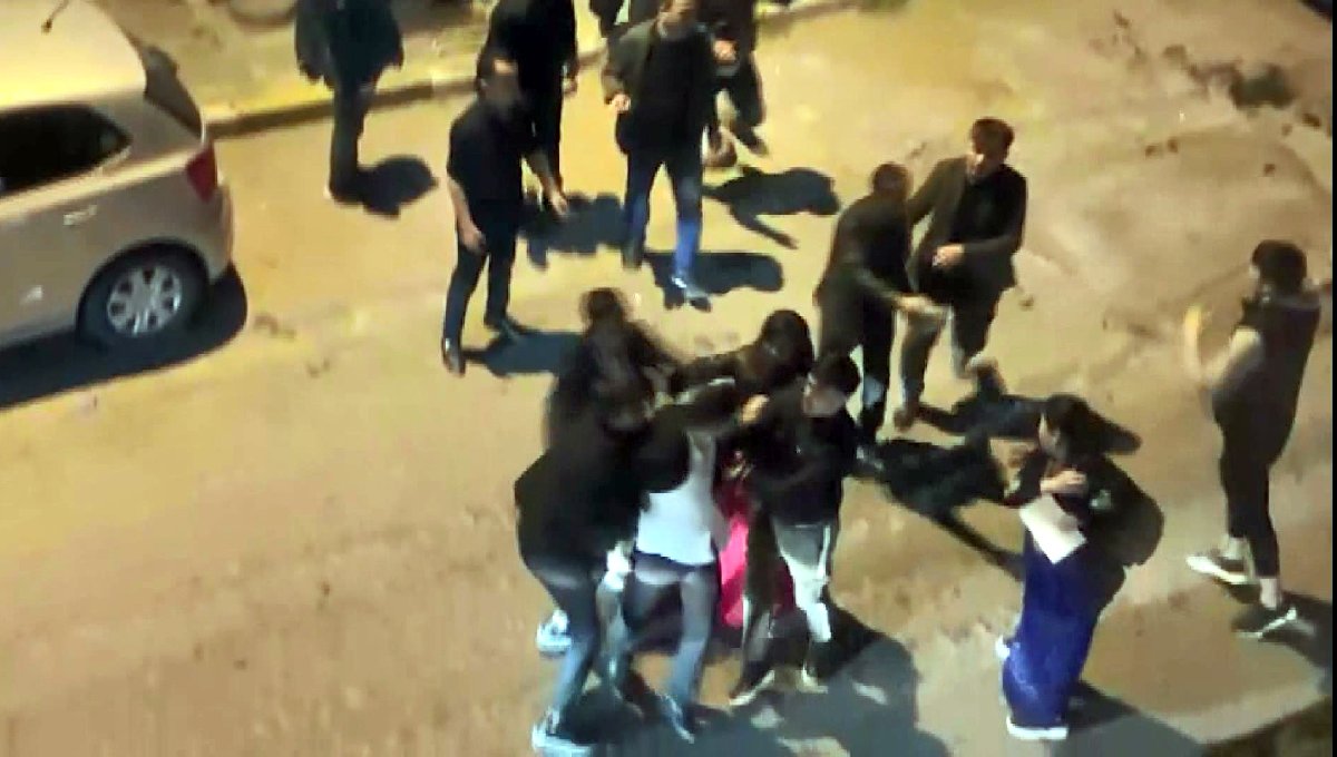 Bir birlerine tekme, tokat ve yumrukla saldıran grup arasındaki arbede birkaç dakika sürerken yapılan ihbar üzerine bölgeye polis ekipleri sevk edildi. Cep telefonu ile kaydedilen kavgada polisin geldiğini gören gruptakiler ara sokaklarda gözden kayboldu. (DHA)