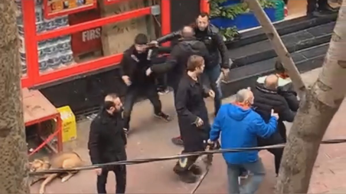 İstanbul Cihangir'de yanındaki kadına hakaret eden ve şiddet gösteren adamı, esnaf durdurdu. Bir süre sonra buraya tekrar gelen ve alkollü olduğu öne sürülen adam, yanındaki arkadaşlarıyla esnafa sopa ve kılıçla saldırdı.