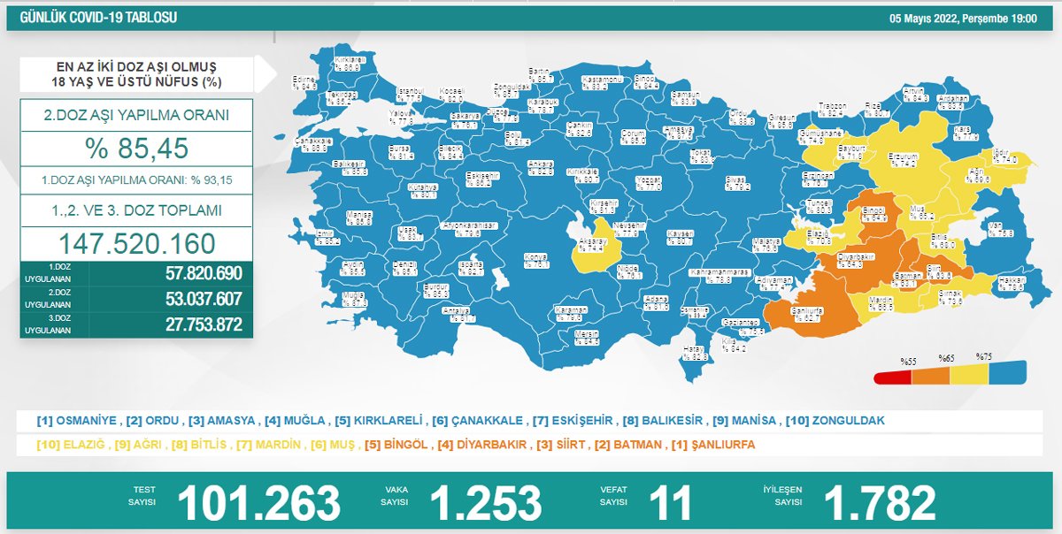 En az 2 doz aşı olmuş 18 yaş üzeri nüfusu kapsayan verilere göre Türkiye'de 2. doz aşılama ortalama yüzde 85,45 oldu. 1. doz ortalaması yüzde 93,15 olurken, 1., 2. ve 3. doz aşısını olan vatandaş sayısı toplamda 147 milyon 520 bin 160’a yükseldi.