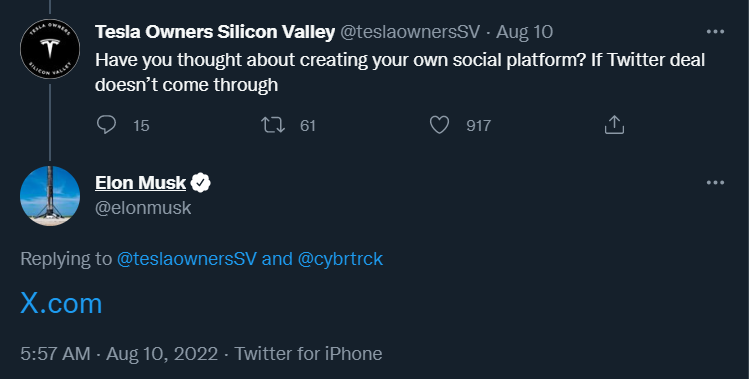 Musk'ın belirttiği x.com, aslında 2017'den beri şu anki halinde. X.com, 2000 yılında PayPal ödeme sistemi geliştiricisi Continuity ile birleşti. Musk sonunda PayPal'ı kurdu ve CEO pozisyonunu üstlendi.