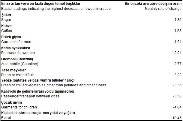 TÜİK, aralıkta fiyatı en fazla düşen temel başlıkları da açıkladı. Buna göre aralıkta bir önceki aya göre fiyatlar; şekerde yüzde 1,35, kahvede yüzde 1,53, erkek giyimde yüzde 1,91, kadın ayakkabısında yüzde 2,01, otomobilde yüzde 2,77, taze meyvelerde yüzde 3,23, sebzede yüzde 3,36, karayolu ile şehirlerarası yolcu taşımacılığında yüzde 3,58, çocuk giyimde yüzde 4,84, kişisel ulaştırma araçlarının yakıt ve yağlarında yüzde 10,45 oranında düştü.