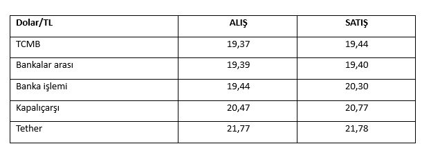 Dolar/TL kuru, perşembe günü bankalar arası kurda kapanışta 19,39 TL ile fiyatlanırken Kapalıçarşı'da 20,47 alış ve 20,77 satış fiyatıyla işlem gördü. Banka işlemlerinde ise kur farkı 1 TL'yi aştı. Kimi vatandaşların dolara endeksli kripto varlık olan Tether'e yönelmesi ise gündem oldu.