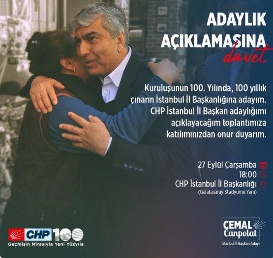 Cemal Canpolat, adaylık açıklamasını 27 Eylül Çarşamba günü saat 18.00’de CHP İstanbul İl Başkanlığı’nda yapacak.