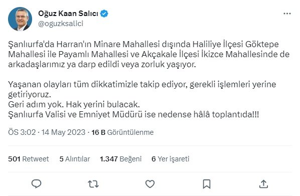 *Yaşanan olayları tüm dikkatimizle takip ediyor, gerekli işlemleri yerine getiriyoruz. Geri adım yok. Hak yerini bulacak. Şanlıurfa Valisi ve Emniyet Müdürü ise nedense hâlâ toplantıda!!!