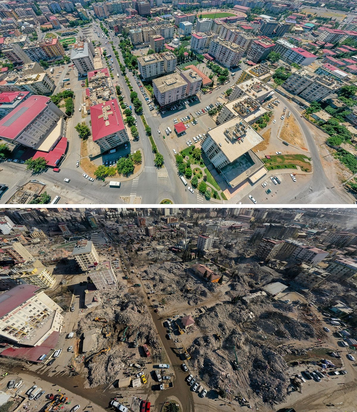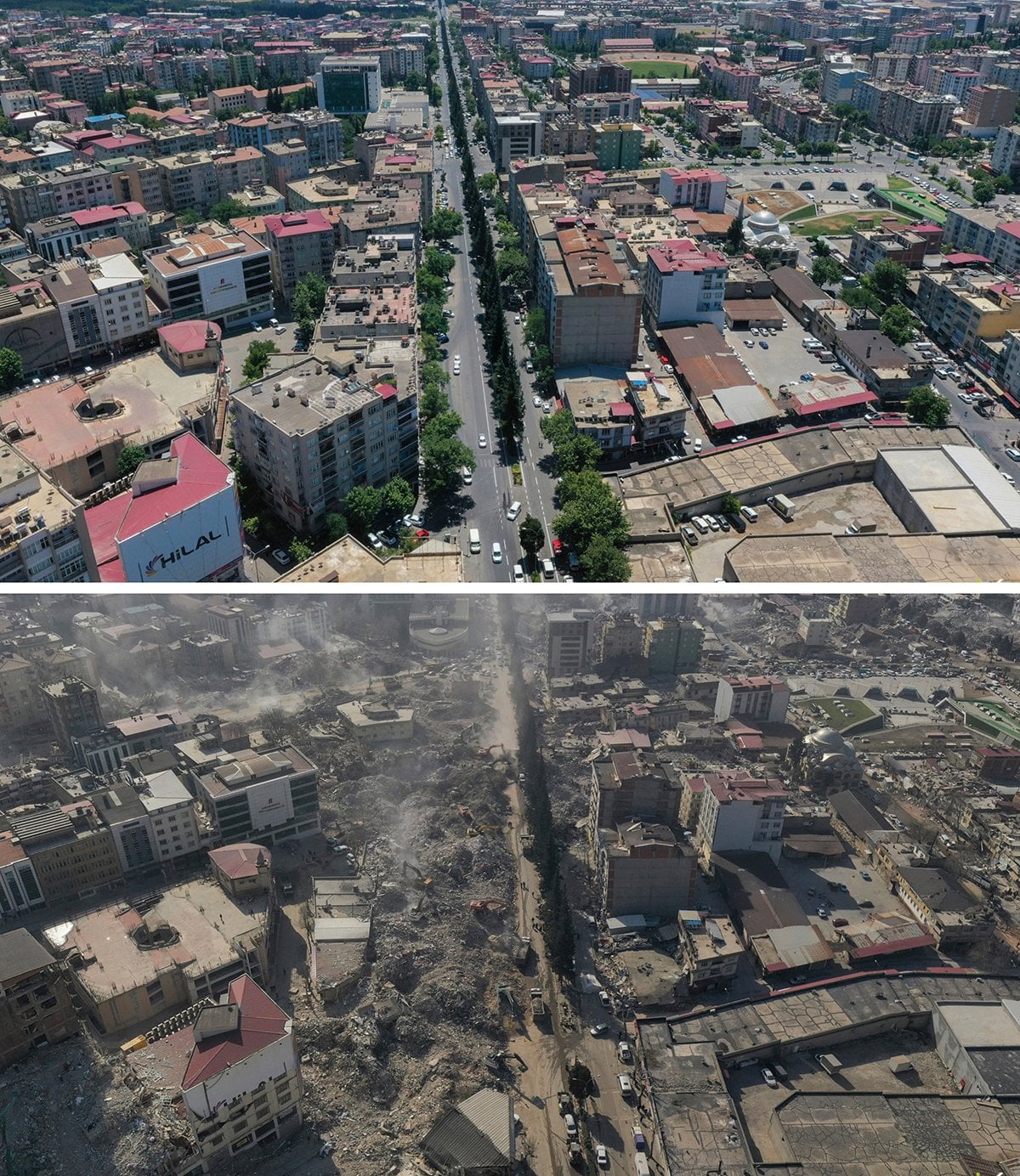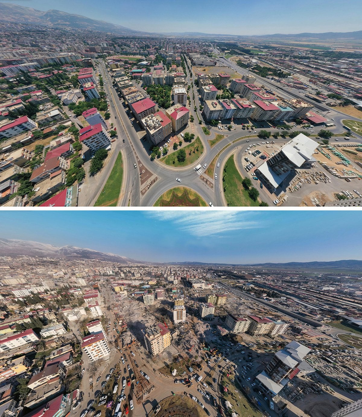 Ekibin deprem öncesi ve sonrasında aynı yerden çektikleri görseller, "asrın felaketi"nin kentte yarattığı yıkımı gözler önüne seriyor.