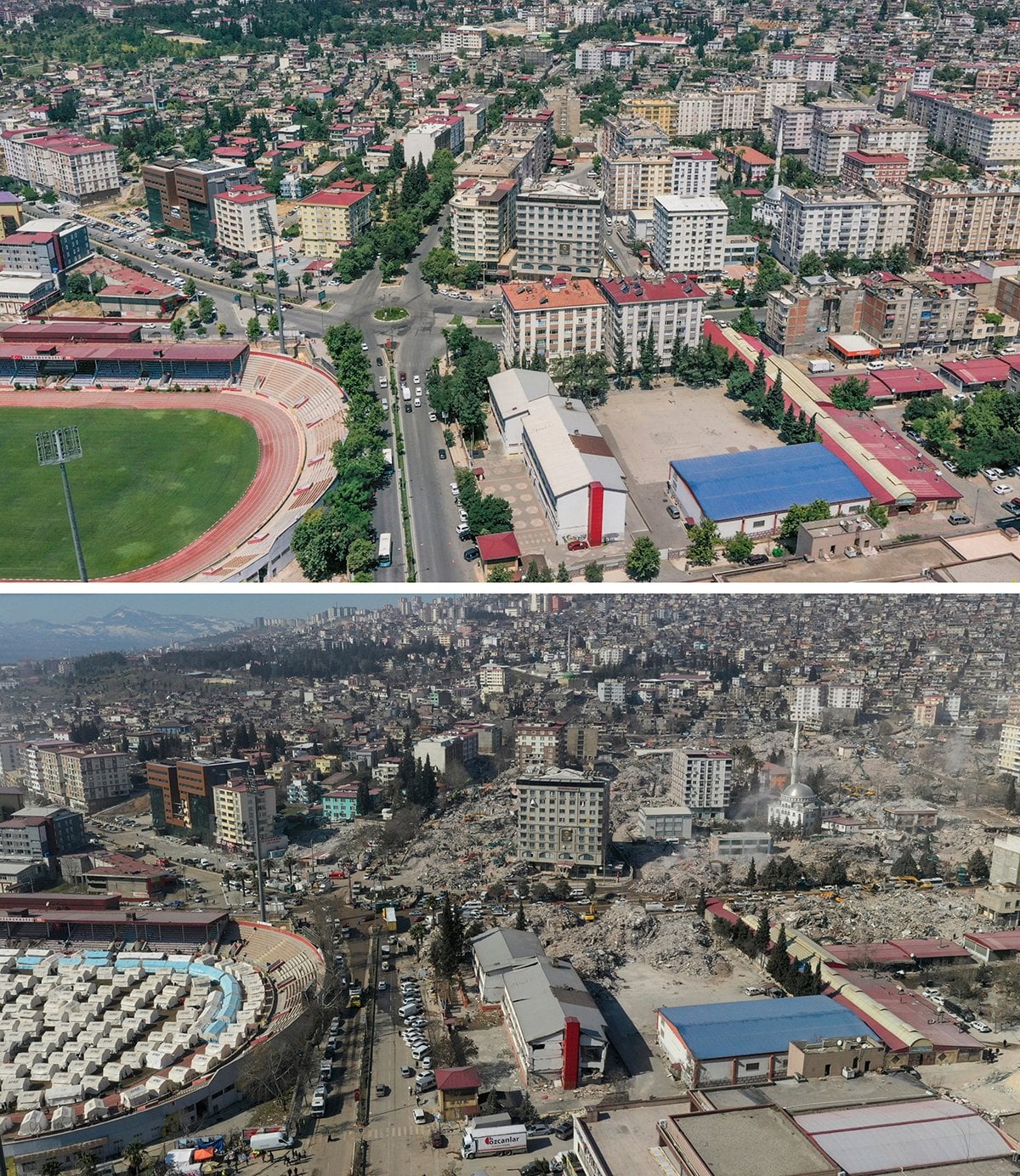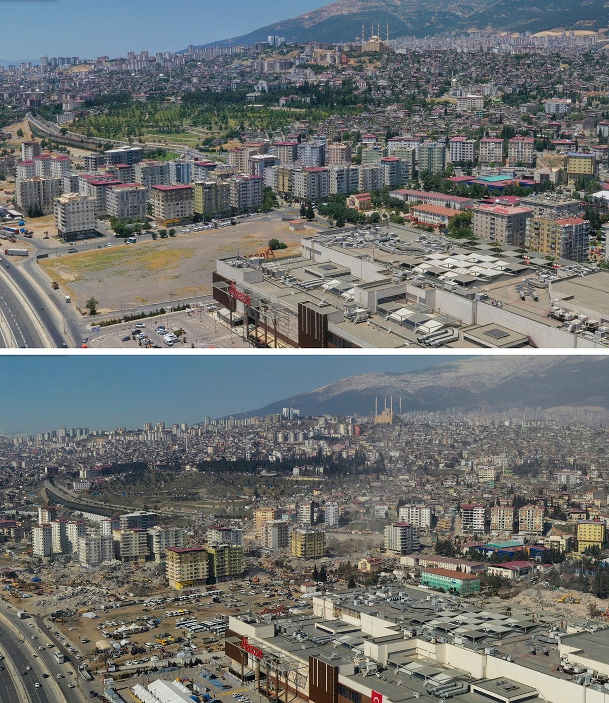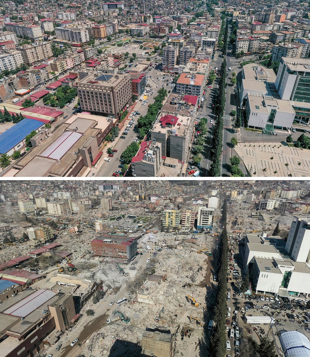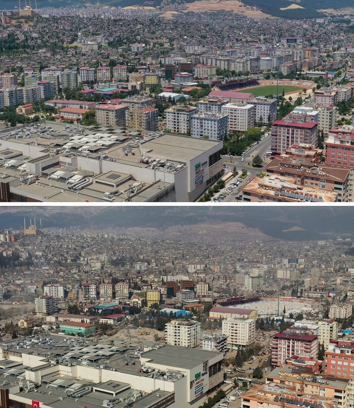 Ekibin deprem öncesi ve sonrasında aynı yerden çektikleri görseller, "asrın felaketi"nin kentte yarattığı yıkımı gözler önüne seriyor.