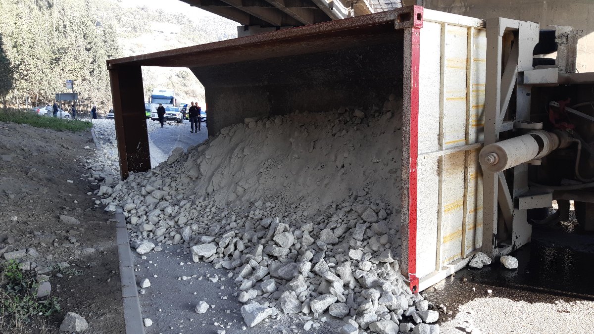 Kara yolunun İstanbul yönünde seyreden A.S. idaresindeki taş yüklü TIR, Hereke mevkisinde virajı dönerken sol tarafa doğru devrildi.