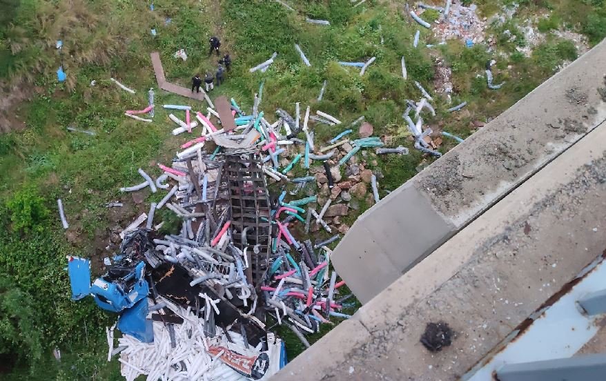 Savrularak yan yatan TIR metrelerce sürüklenerek bariyerlere çarptı. Bariyerleri parçalayarak 60 metrelik yükseklikten dere yatağına düşen TIR demir yığınına döndü.